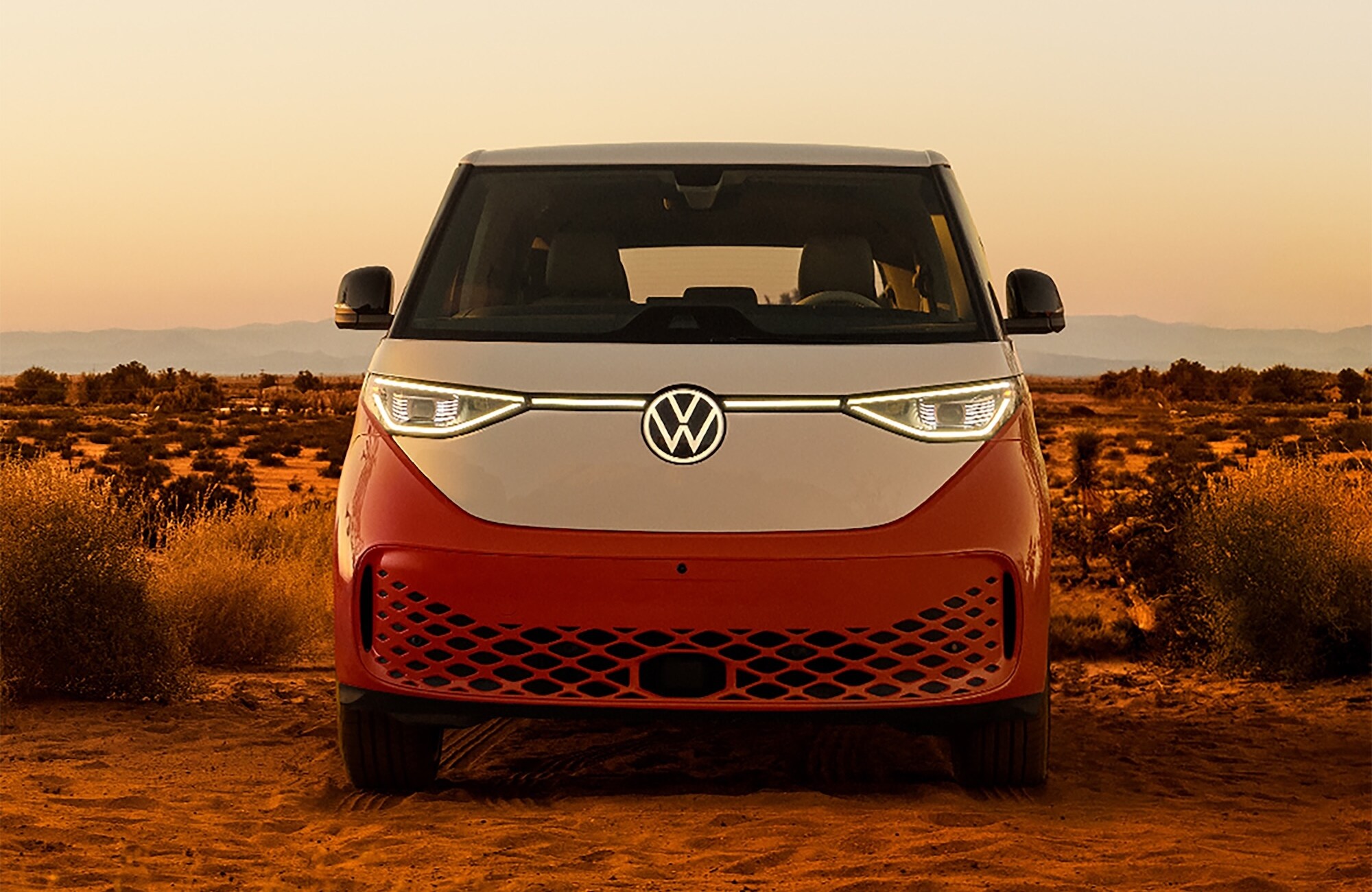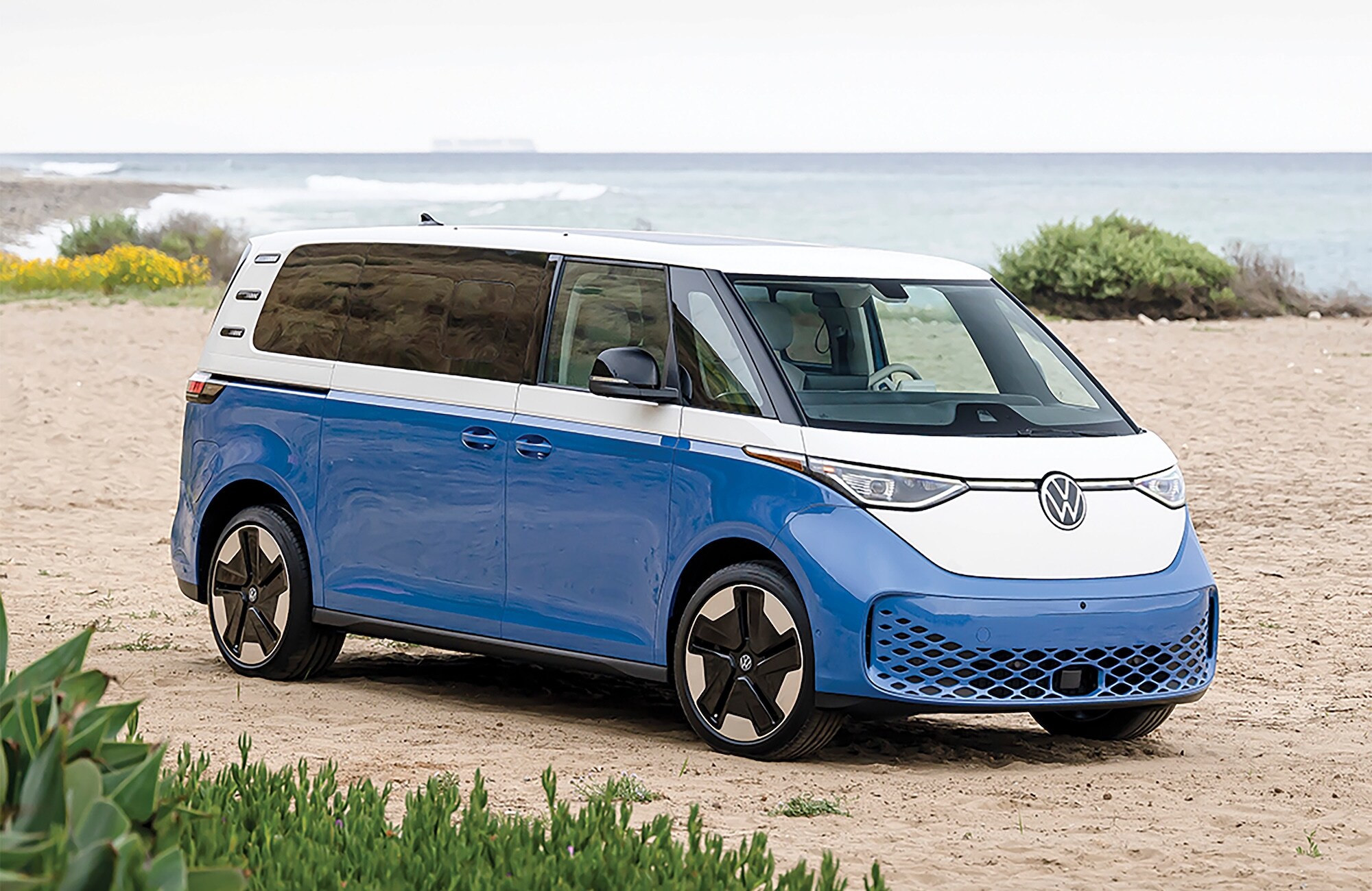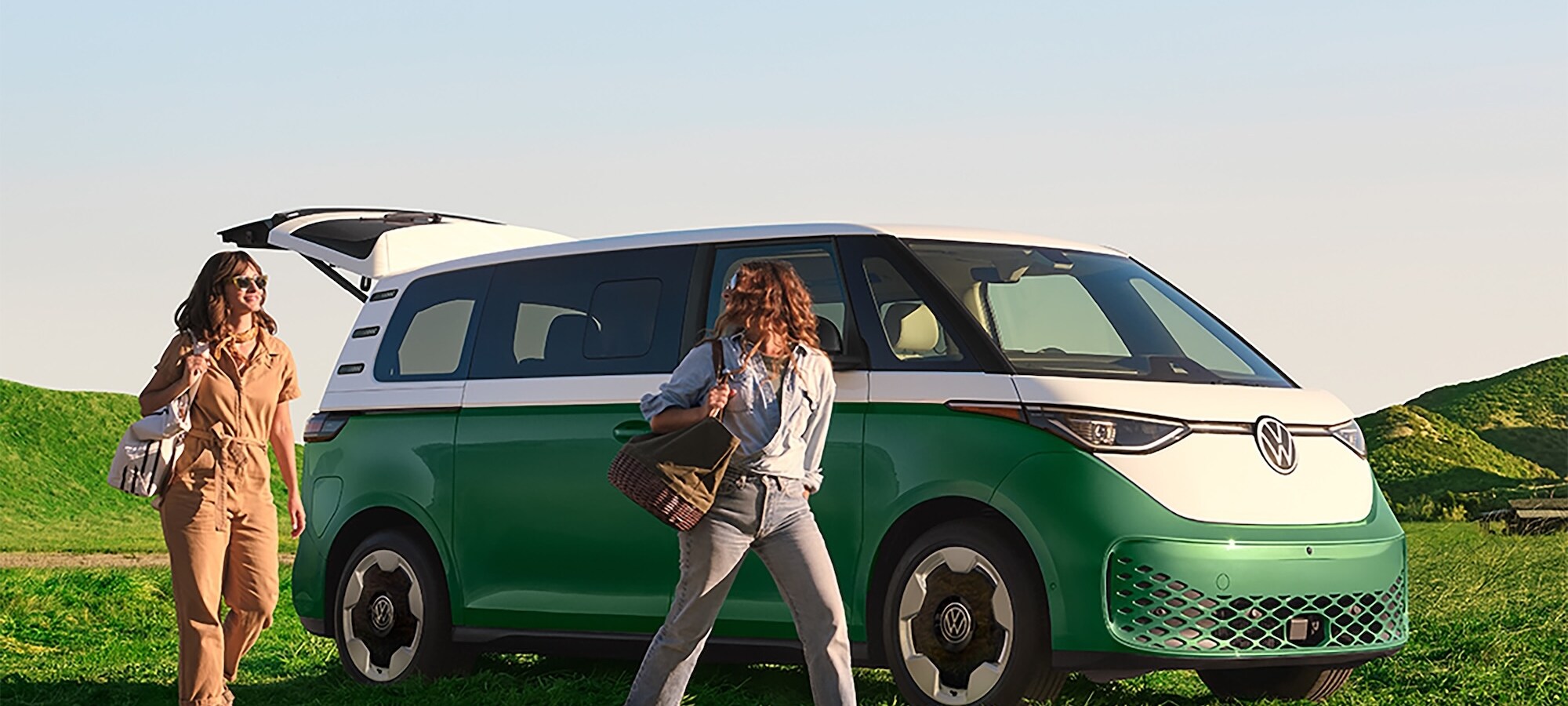 The ID. Buzz's whimsical two-tone exterior pays homage to its hippie-era predecessor with smooth, rounded shapes and available 20-inch alloy wheels. Signature LED headlights and taillights provide a distinctive light signature. Power sliding side doors allow easy access to the rear seats, while an available power liftgate simplifies loading cargo. A fixed glass roof panel bathes the interior in natural light.