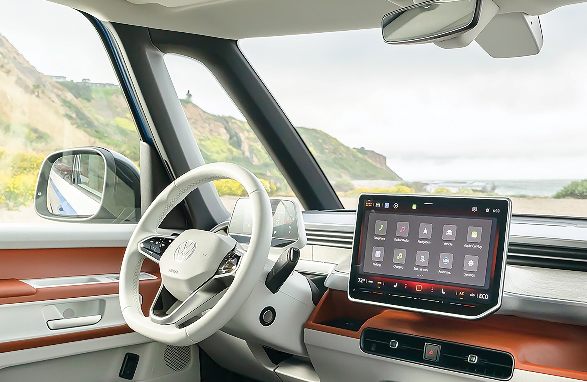 Inside the ID. Buzz's airy cabin offers an appealing blend of retro design cues and modern tech. Heated and ventilated front seats with massage are available, as well as dual captain's chairs in the second row. The large 12.9-inch Discover Pro Max touchscreen offers intuitive navigation, while an optional Harman Kardon audio system with 13 speakers provides crystal-clear sound. Sustainable upholstery choices include perforated V-Tex leatherette in several color schemes.