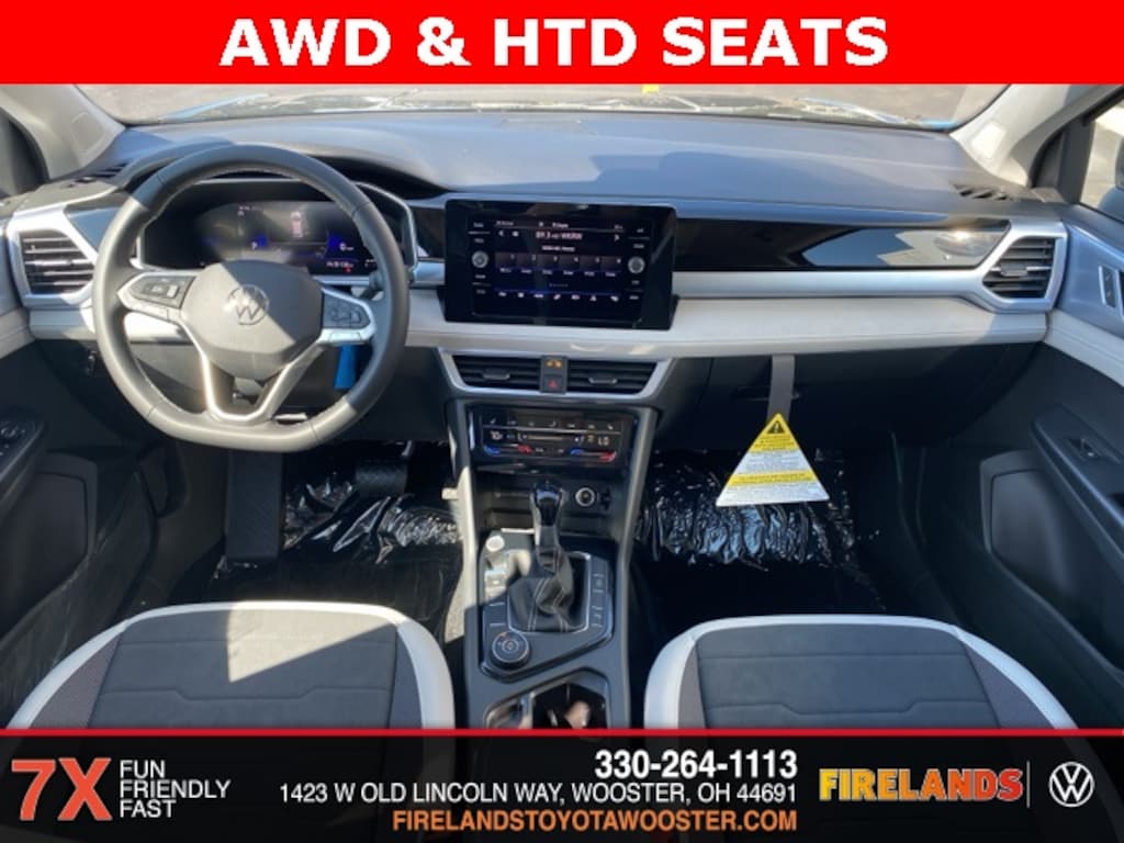 Platinum Gray Metallic 2025 Volkswagen Taos 1.5T SE AWD & HTD SEATS AWD 8-Speed Automatic with Tiptronic 1.5L I4 Turbocharged DOHC 16V LEV3-SULEV30 174hp 4WD/4X4/AWD, Heated Seats, Heated Steering Wheel, Remote Start, CarPlay, Android Auto, Bluetooth, Backup Camera, Rain Sensing Wipers, Blind Spot Monitoring, Adaptive Cruise Control, Lane Departure Warning, Parking Sensors, Brake Assist, Steering Wheel Controls, Cruise Control, Keyless Start, Keyless Entry, Satellite Radio, Premium/Alloy Wheels, 1.5L I4 Turbocharged DOHC 16V LEV3-SULEV30 174hp, AWD, 6 Speakers, ABS brakes, Active Blind Spot Monitor, AM/FM radio: SiriusXM with 360L, Auto-Dimming Rearview Mirror w/HomeLink Connect, Automatic temperature control, Brake assist, CloudTex & Cloth Seating Surfaces, Compass, Dual front impact airbags, Emergency communication system: VW Car-Net Safe & Secure 5-year, Exterior Parking Camera Rear, Front Bucket Seats, Front dual zone A/C, Front Strut Rear Multi-Link Suspension, Fully automatic headlights, Heated Front Bucket Seats, Heated front seats, Heated steering wheel, Illuminated entry, Leather Shift Knob, Low tire pressure warning, Outside temperature display, Panoramic Sunroof Package, Power driver seat, Radio: MIB3 Composition Media AM/FM/HD, Rain sensing wipers, Remote keyless entry, Rubber Mats Kit, Spoiler, Steering wheel mounted audio controls, Tachometer, Traction control, VW Care, Wheels: 18" 2-Tone Machined Alloy.