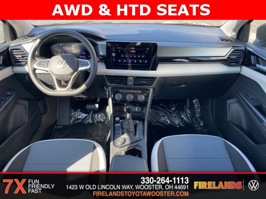 Deep Black Pearl 2025 Volkswagen Taos 1.5T S AWD & HTD SEATS AWD 8-Speed Automatic with Tiptronic 1.5L I4 Turbocharged DOHC 16V LEV3-SULEV30 174hp 4WD/4X4/AWD, Heated Seats, Heated Steering Wheel, CarPlay, Android Auto, Bluetooth, Backup Camera, Rain Sensing Wipers, Blind Spot Monitoring, Adaptive Cruise Control, Lane Departure Warning, Brake Assist, Steering Wheel Controls, Keyless Start, Keyless Entry, Premium/Alloy Wheels, 4D Sport Utility, AWD, Active Blind Spot Monitor, Air Conditioning, Auto High-beam Headlights, Brake assist, Cloth Seating Surfaces, Compass, Dual front impact airbags, Emergency communication system: VW Car-Net Safe & Secure 5-year, Exterior Parking Camera Rear, Front anti-roll bar, Front Bucket Seats, Front Strut Rear Multi-Link Suspension, Fully automatic headlights, Heated Front Bucket Seats, Heated front seats, Heated steering wheel, Illuminated entry, Leather Shift Knob, Low tire pressure warning, Outside temperature display, Panic alarm, Power door mirrors, Power steering, Radio data system, Radio: MIB3 Composition Color AM/FM, Rain sensing wipers, Rear anti-roll bar, Remote keyless entry, Rubber Mats Kit, Split folding rear seat, Spoiler, Steering wheel mounted audio controls, Traction control, Trip computer, VW Care, Wheels: 18" 2-Tone Machined Alloy.