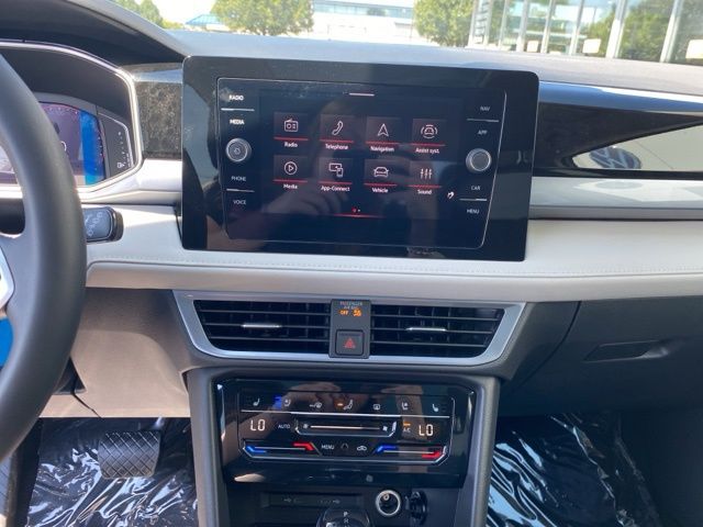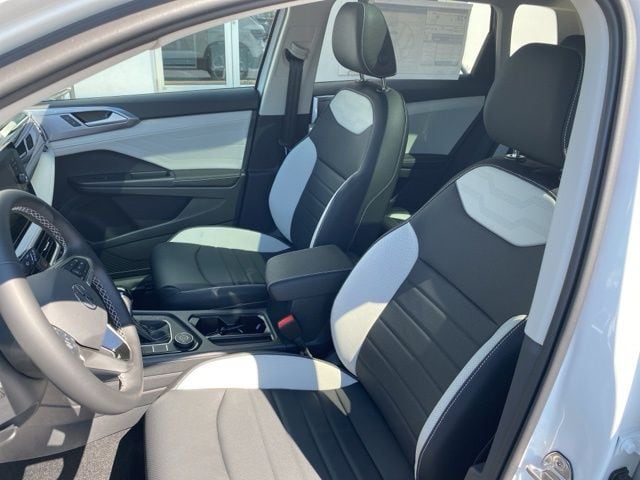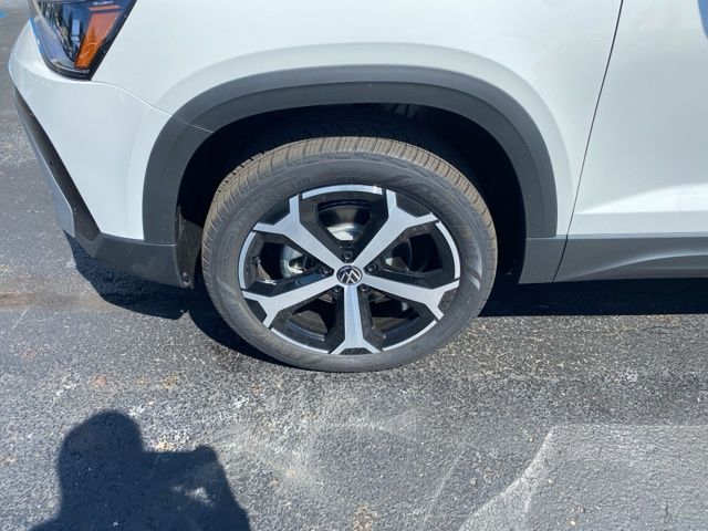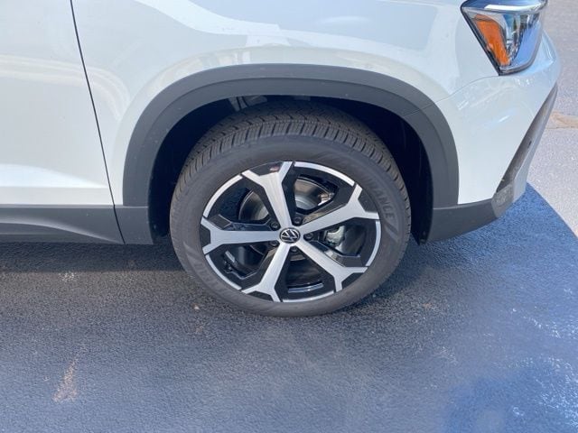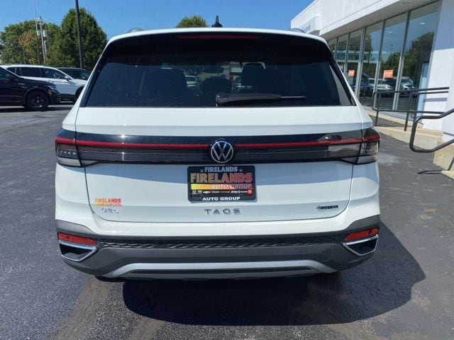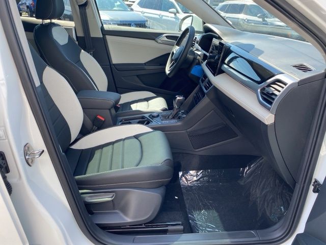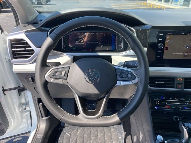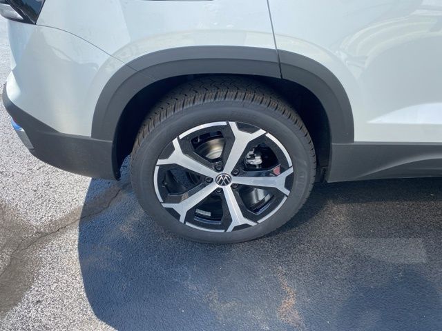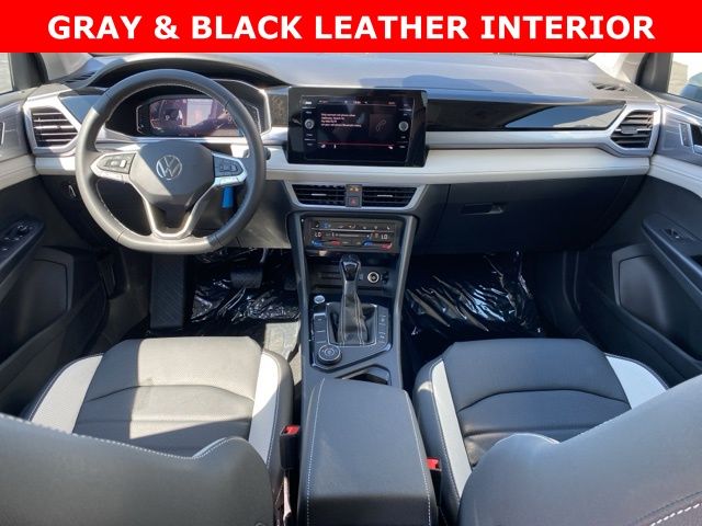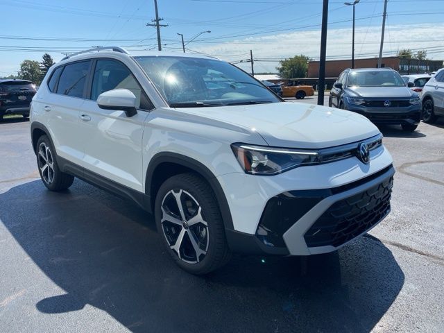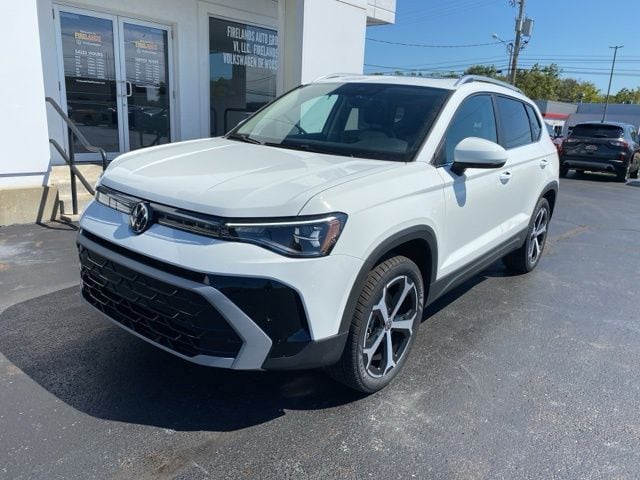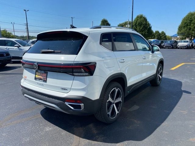 Pure White 2025 Volkswagen Taos 1.5T SEL HTD LEATHER SEATS AWD 8-Speed Automatic with Tiptronic 1.5L I4 Turbocharged DOHC 16V LEV3-SULEV30 174hp 4WD/4X4/AWD, Leather Seats, Heated Seats, Heated Steering Wheel, Sunroof/Moonroof, Panoramic Roof, Remote Start, Navigation System, CarPlay, Android Auto, Bluetooth, Backup Camera, Rain Sensing Wipers, Blind Spot Monitoring, Adaptive Cruise Control, Lane Departure Warning, Parking Sensors, Brake Assist, Steering Wheel Controls, Keyless Start, Keyless Entry, Premium/Alloy Wheels, 4D Sport Utility, 1.5L I4 Turbocharged DOHC 16V LEV3-SULEV30 174hp, 6 Speakers, ABS brakes, Active Blind Spot Monitor, AM/FM radio: SiriusXM with 360L, Auto-Dimming Rearview Mirror w/HomeLink Connect, Automatic temperature control, Brake assist, Compass, Driver door bin, Electronic Stability Control, Emergency communication system: VW Car-Net Safe & Secure 5-year, Exterior Parking Camera Rear, First Aid Kit, Front dual zone A/C, Front Strut Rear Multi-Link Suspension, Fully automatic headlights, Heated & Actively Ventilated Front Bucket Seats, Heated door mirrors, Heated front seats, Heated steering wheel, Illuminated entry, Leather Shift Knob, Low tire pressure warning, Navigation system: VW Car-Net Guide & Inform, Overhead airbag, Panic alarm, Perforated Vienna Leather Seating Surfaces, Power driver seat, Power moonroof, Power steering, Radio: MIB3 Discover Media AM/FM/HD, Rain sensing wipers, Rear anti-roll bar, Remote keyless entry, Security system, Speed control, Spoiler, Steering wheel mounted audio controls, Traction control, Ventilated front seats, VW Care, Wheels: 19" 2-Tone Machined Alloy.