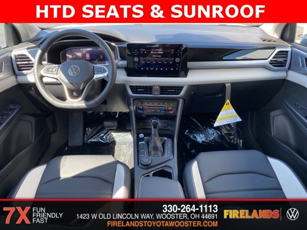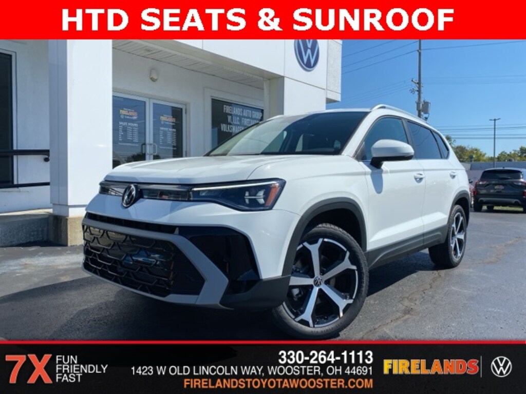 Pure White 2025 Volkswagen Taos 1.5T SEL HTD SEATS & SUNROOF AWD 8-Speed Automatic with Tiptronic 1.5L I4 Turbocharged DOHC 16V LEV3-SULEV30 174hp 4WD/4X4/AWD, Leather Seats, Heated Seats, Heated Steering Wheel, Sunroof/Moonroof, Panoramic Roof, Remote Start, Navigation System, CarPlay, Android Auto, Bluetooth, Backup Camera, Rain Sensing Wipers, Blind Spot Monitoring, Adaptive Cruise Control, Lane Departure Warning, Parking Sensors, Brake Assist, Steering Wheel Controls, Cruise Control, Keyless Start, Keyless Entry, Premium/Alloy Wheels, 4D Sport Utility, AWD, Active Blind Spot Monitor, AM/FM radio: SiriusXM with 360L, Automatic temperature control, Brake assist, Emergency communication system: VW Car-Net Safe & Secure 5-year, Exterior Parking Camera Rear, Front Bucket Seats, Front dual zone A/C, Front Strut Rear Multi-Link Suspension, Fully automatic headlights, Heated & Actively Ventilated Front Bucket Seats, Heated front seats, Heated steering wheel, Illuminated entry, Leather Shift Knob, Navigation system: VW Car-Net Guide & Inform, Perforated Vienna Leather Seating Surfaces, Power driver seat, Power moonroof, Power steering, Radio data system, Radio: MIB3 Discover Media AM/FM/HD, Rain sensing wipers, Remote keyless entry, Speed control, Spoiler, Steering wheel mounted audio controls, Traction control, Ventilated front seats, Wheels: 19" 2-Tone Machined Alloy.