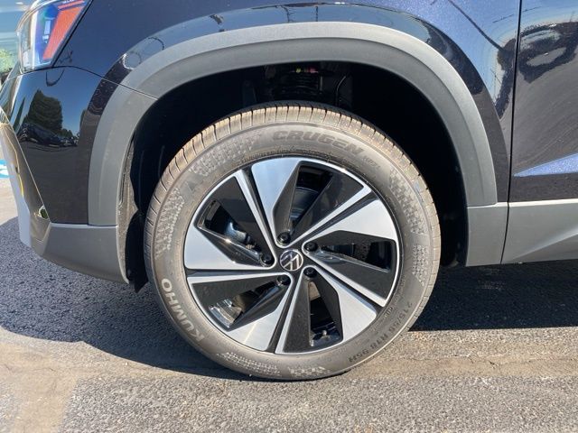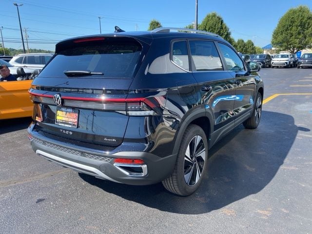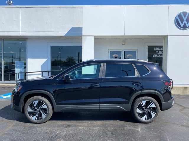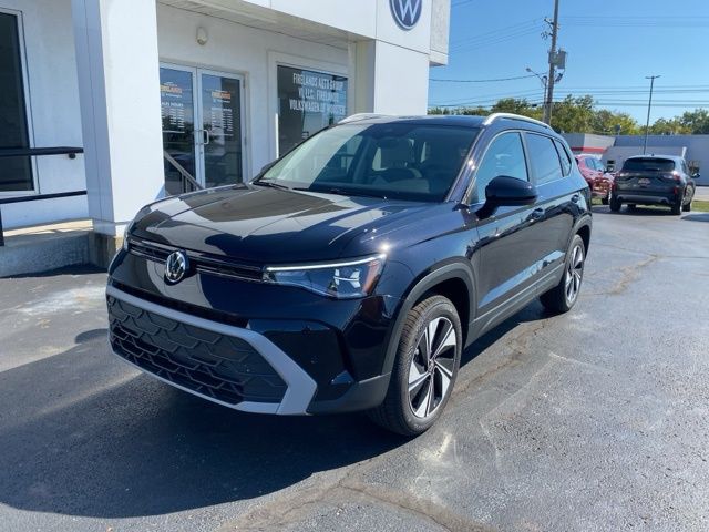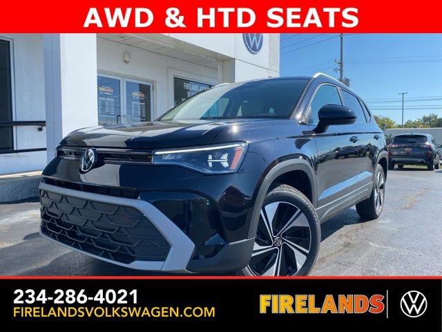 Deep Black Pearl 2025 Volkswagen Taos 1.5T SE AWD & HTD SEATS AWD 8-Speed Automatic with Tiptronic 1.5L I4 Turbocharged DOHC 16V LEV3-SULEV30 174hp 4WD/4X4/AWD, Heated Seats, Heated Steering Wheel, Remote Start, CarPlay, Android Auto, Bluetooth, Backup Camera, Rain Sensing Wipers, Blind Spot Monitoring, Adaptive Cruise Control, Lane Departure Warning, Parking Sensors, Brake Assist, Steering Wheel Controls, Keyless Start, Keyless Entry, Satellite Radio, Premium/Alloy Wheels, 4D Sport Utility, AWD, 4-Wheel Disc Brakes, 6 Speakers, ABS brakes, Active Blind Spot Monitor, Auto High-beam Headlights, Automatic temperature control, Brake assist, CloudTex & Cloth Seating Surfaces, Compass, Driver door bin, Dual front side impact airbags, Emergency communication system: VW Car-Net Safe & Secure 5-year, Exterior Parking Camera Rear, First Aid Kit, Front Bucket Seats, Front dual zone A/C, Front reading lights, Fully automatic headlights, Heated door mirrors, Heated Front Bucket Seats, Heated front seats, Heated steering wheel, Illuminated entry, Leather Shift Knob, Low tire pressure warning, Occupant sensing airbag, Overhead console, Panoramic Sunroof Package, Passenger vanity mirror, Power driver seat, Power windows, Radio data system, Radio: MIB3 Composition Media AM/FM/HD, Rain sensing wipers, Rear anti-roll bar, Remote keyless entry, Roadside Assistance Kit, Rubber Mats Kit, Speed-sensing steering, Spoiler, Steering wheel mounted audio controls, Traction control, VW Care, Wheels: 18" 2-Tone Machined Alloy.