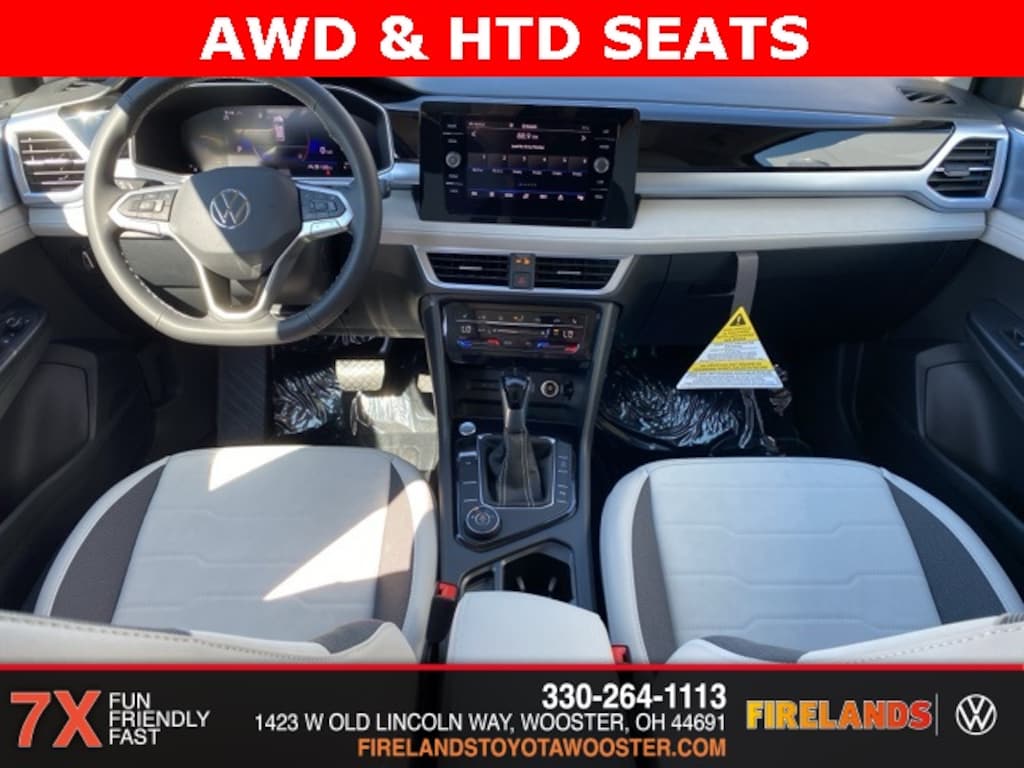 Deep Black Pearl 2025 Volkswagen Taos 1.5T SE AWD & HTD SEATS AWD 8-Speed Automatic with Tiptronic 1.5L I4 Turbocharged DOHC 16V LEV3-SULEV30 174hp 4WD/4X4/AWD, Heated Seats, Heated Steering Wheel, Remote Start, CarPlay, Android Auto, Bluetooth, Backup Camera, Rain Sensing Wipers, Blind Spot Monitoring, Adaptive Cruise Control, Lane Departure Warning, Parking Sensors, Brake Assist, Steering Wheel Controls, Keyless Start, Keyless Entry, Satellite Radio, Premium/Alloy Wheels, 4D Sport Utility, AWD, 6 Speakers, ABS brakes, Active Blind Spot Monitor, Automatic temperature control, Brake assist, CloudTex & Cloth Seating Surfaces, Dual front side impact airbags, Emergency communication system: VW Car-Net Safe & Secure 5-year, Exterior Parking Camera Rear, First Aid Kit, Front Bucket Seats, Front dual zone A/C, Fully automatic headlights, Heated door mirrors, Heated Front Bucket Seats, Heated steering wheel, Illuminated entry, Leather Shift Knob, Low tire pressure warning, Occupant sensing airbag, Panoramic Sunroof Package, Power driver seat, Power windows, Radio: MIB3 Composition Media AM/FM/HD, Rain sensing wipers, Remote keyless entry, Roadside Assistance Kit, Rubber Mats Kit, Speed-sensing steering, Spoiler, Steering wheel mounted audio controls, Traction control, VW Care, Wheels: 18" 2-Tone Machined Alloy.
