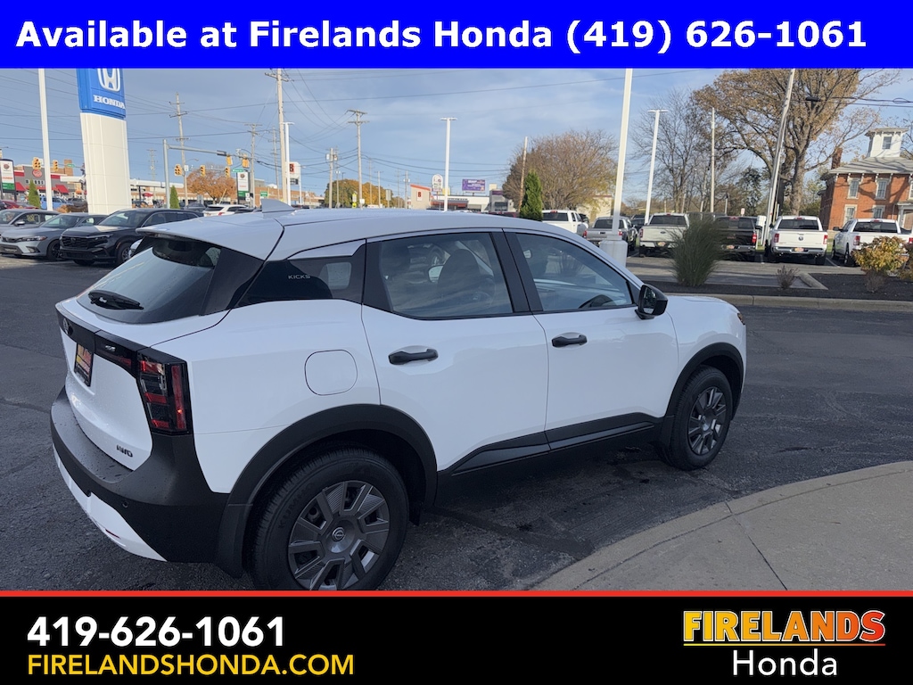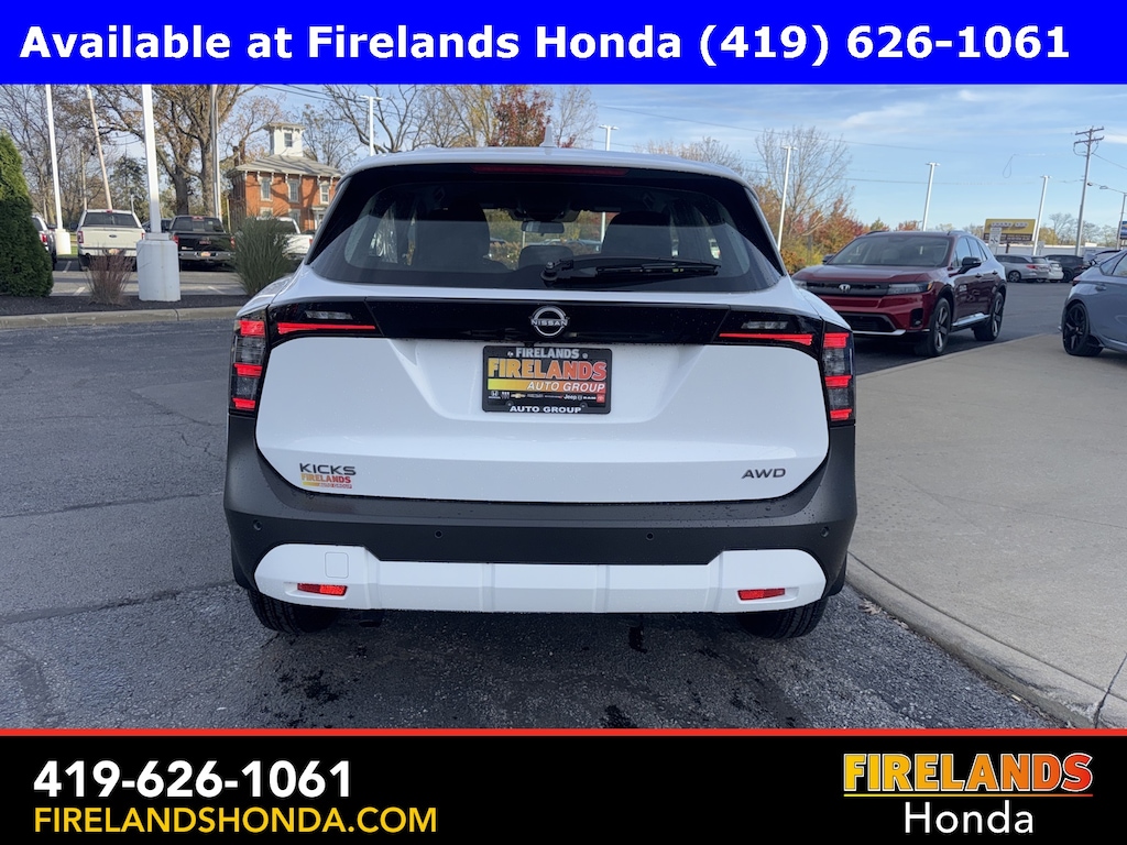 Firelands Honda is proud to offer this outstanding-looking 2025 Nissan Kicks in Fresh Powder. This Kicks has been checked by our award winning service department. Hot features include: Bluetooth Hands Free, Back Up Camera, Adaptive Cruise Control, Balance of Factory Warranty, Service Records Available, All-Wheel Drive, Apple Carplay/Android Auto, Automatic Emergency Braking, Forward Collision Warning, Clean CARFAX, One Owner, No Accidents, Keyless Start, Keyless Entry.