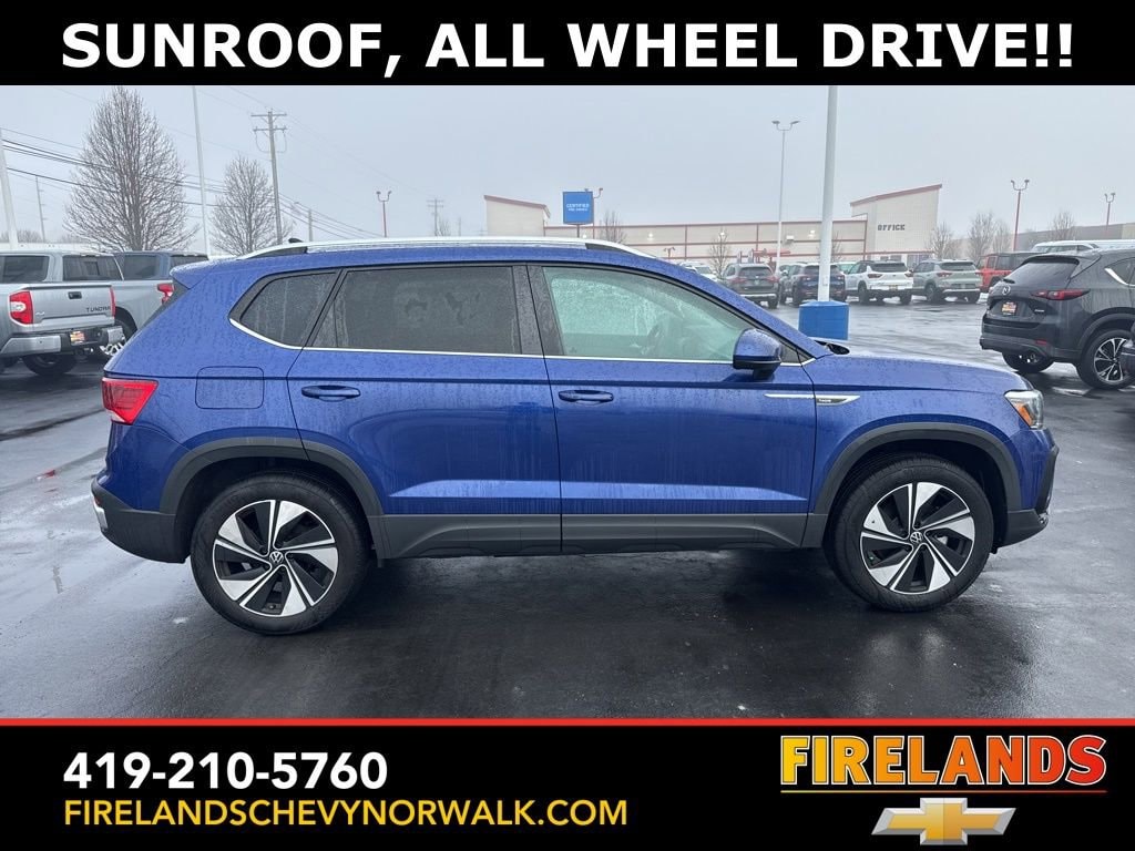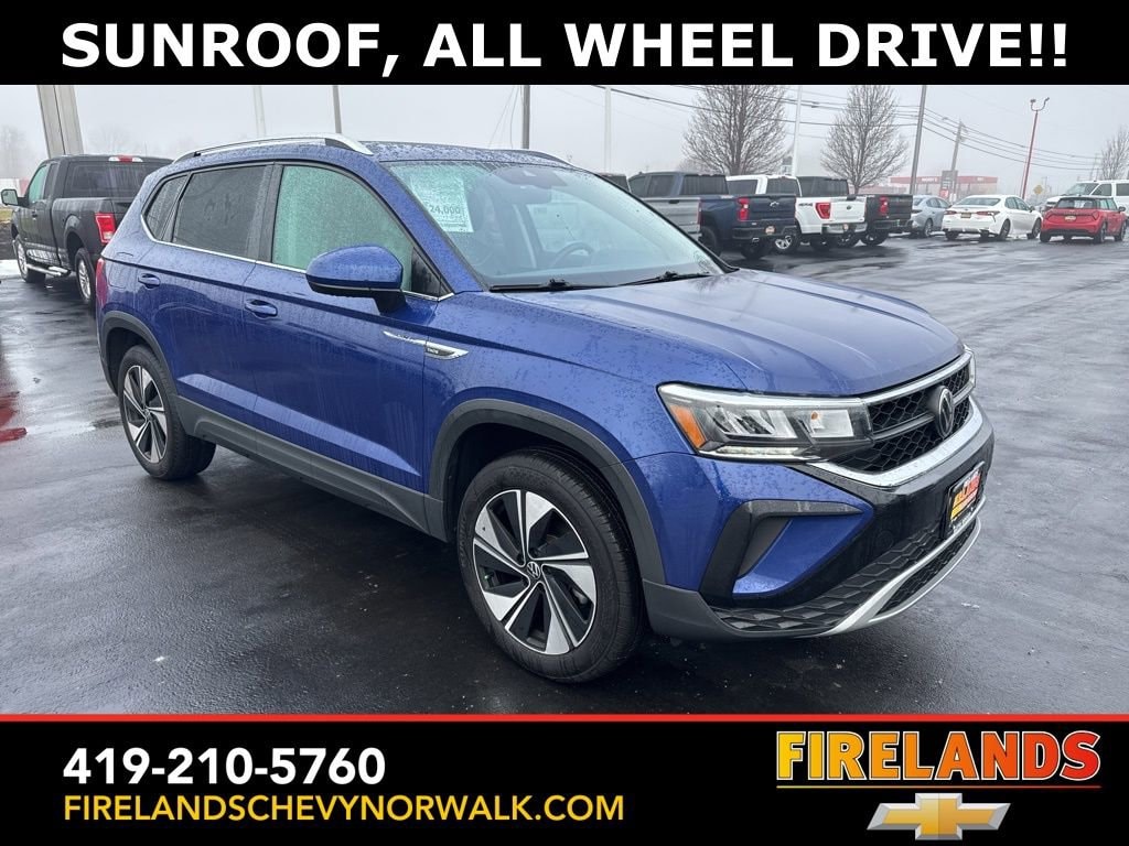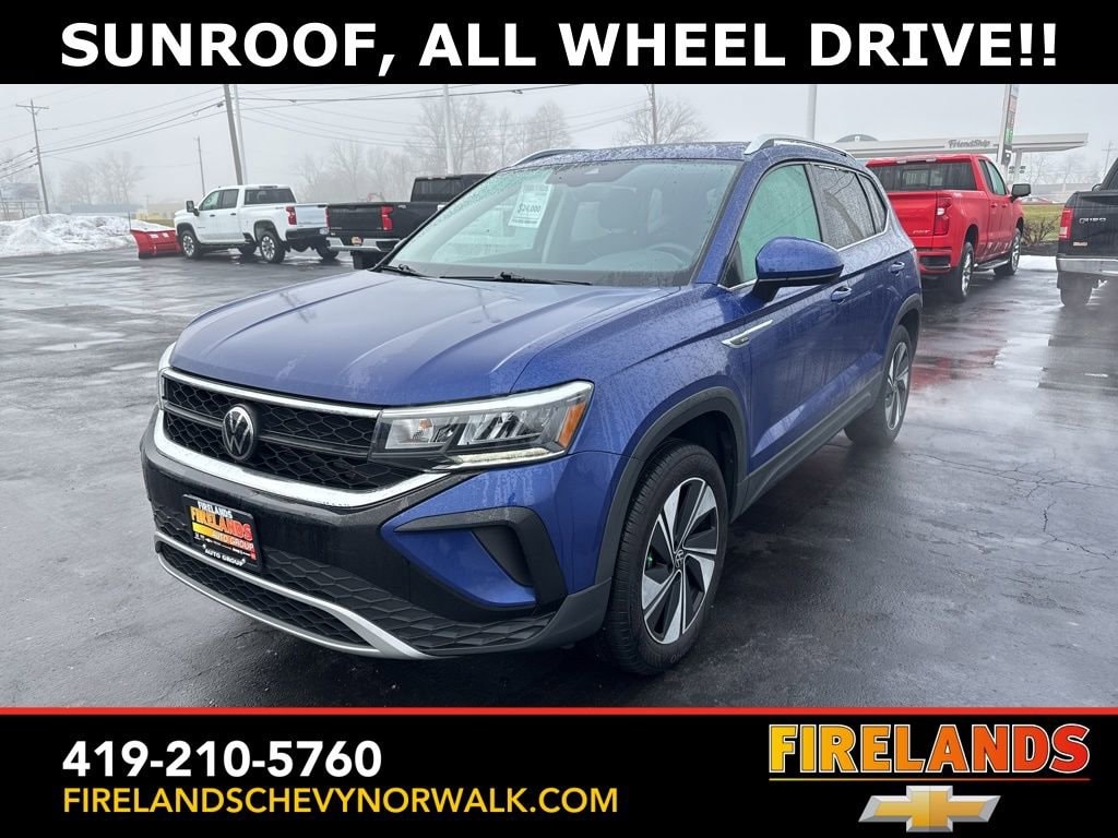 2024 Volkswagen Taos 1.5T SECar Bravo Certified, Great Price, Like New, Heated Seats, Heated Steering Wheel, Remote Start, CarPlay, Android Auto, Bluetooth, Backup Camera, Rain Sensing Wipers, Lane Departure Warning, One Owner, New Tires, Clean CARFAX, 4WD/4X4/AWD, Bluetooth Hands Free, Back Up Camera, Balance of Factory Warranty, Service Records Available, All-Wheel Drive, Apple Carplay/Android Auto, Blind Spot Detection, Fog Lights, Automatic Emergency Braking, Forward Collision Warning, Rear Cross Traffic Alert, Wireless Charging Pad, Panoramic Moonroof, Heated Front Seats, Taos 1.5T SE AWD, Dusk Blue Metallic, Black w/CloudTex & Cloth Seating Surfaces, Active Blind Spot Monitor, AM/FM radio: SiriusXM with 360L, Automatic temperature control, Brake assist, CloudTex & Cloth Seating Surfaces, Compass, Exterior Parking Camera Rear, Front dual zone A/C, Front Strut Rear Multi-Link Suspension, Fully automatic headlights, Heated door mirrors, Heated Front Bucket Seats, Heated front seats, Illuminated entry, Leather Shift Knob, Low tire pressure warning, Occupant sensing airbag, Outside temperature display, Panoramic Sunroof Package, Passenger vanity mirror, Power driver seat, Radio data system, Rain sensing wipers, Remote keyless entry, Rubber Mats Kit (SNM), Speed control, Spoiler, Steering wheel mounted audio controls, Trip computer, Wheels: 18 2-Tone Machined Alloy.CARFAX One-Owner.AWD 1.5L I4 Turbocharged DOHC 16V LEV3-SULEV30 158hp 7-Speed DSG Automatic with TiptronicPriced below KBB Fair Purchase Price! Odometer is 6386 miles below market average! 24/32 City/Highway MPGWelcome to the Firelands Family!! We understand that you donât want to come to a dealership and play games for hours. Thatâs why we focus on a few key principles: Be Really Fast Be Really Friendly, Be Really Fun, Be Really Honest. The price you see is the price you pay; plain and simple! We price our cars NOT our customers and hope that you have fun when you are here. We will never advertise misleading or confusing payments thatâs not our style. Rather, we hope to give you the best retail experience possible; after all: we LIVE off repeat and referral business. Our Vehicle Specialists are NOT paid on the profit (or loss) of a vehicle. You have DIRECT access to our Sales and Finance Managers cell phone numbers. We canât wait to put our best foot forward and have you leave smiling for years to come!